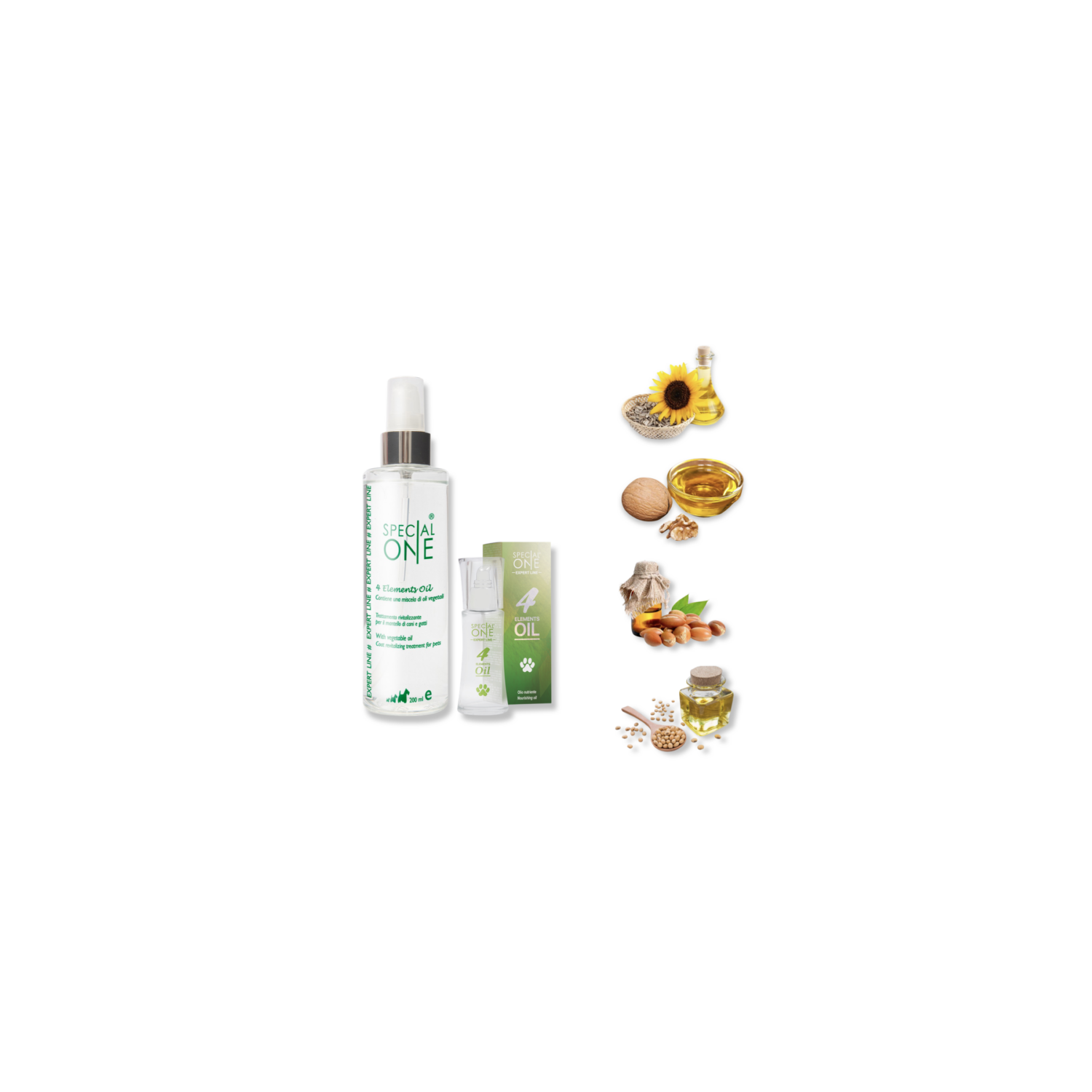 - 4 Elements Oil è una miscela di oli appositamente studiata per rinforzare e ricostruire il manto. È efficace sul pelo sfibrato, danneggiato e stressato, poiché la sua azione ristrutturante e rivitalizzante è immediata.