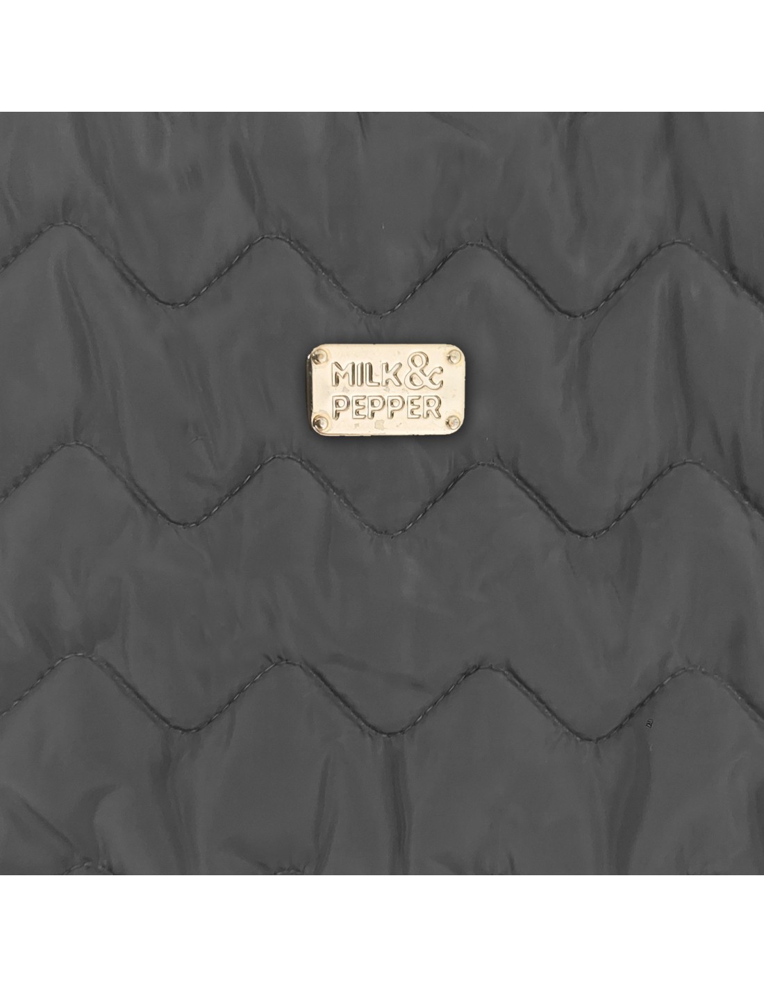 Piccola targhetta "Milk&Pepper" in metallo dorato applicata sulla parte superiore della schiena