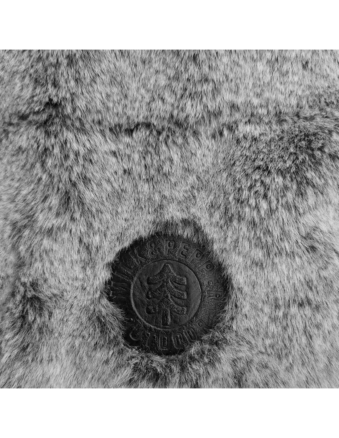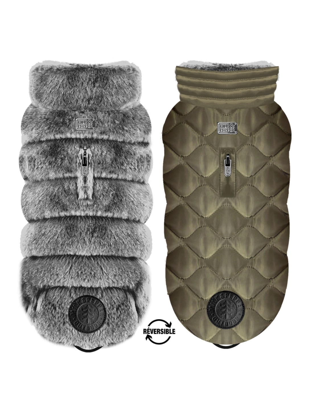 Lato uno: morbidissima pelliccia fantasia grigio/nera - lato due: poliestere trapuntato kaki (idrorepellente)