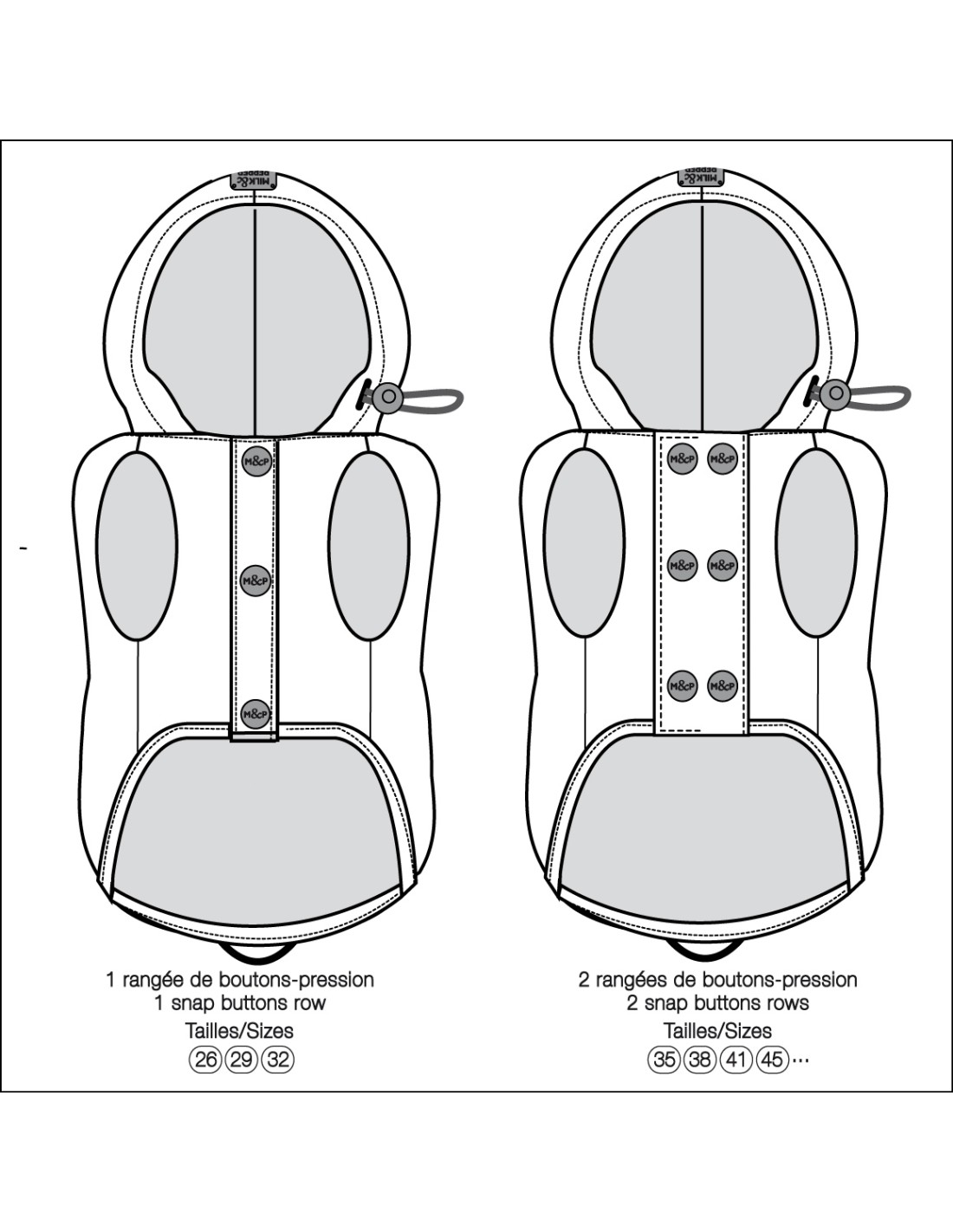 Apertura/chiusura sottopancia con bottoni automatici dorati con inciso “M&P”.