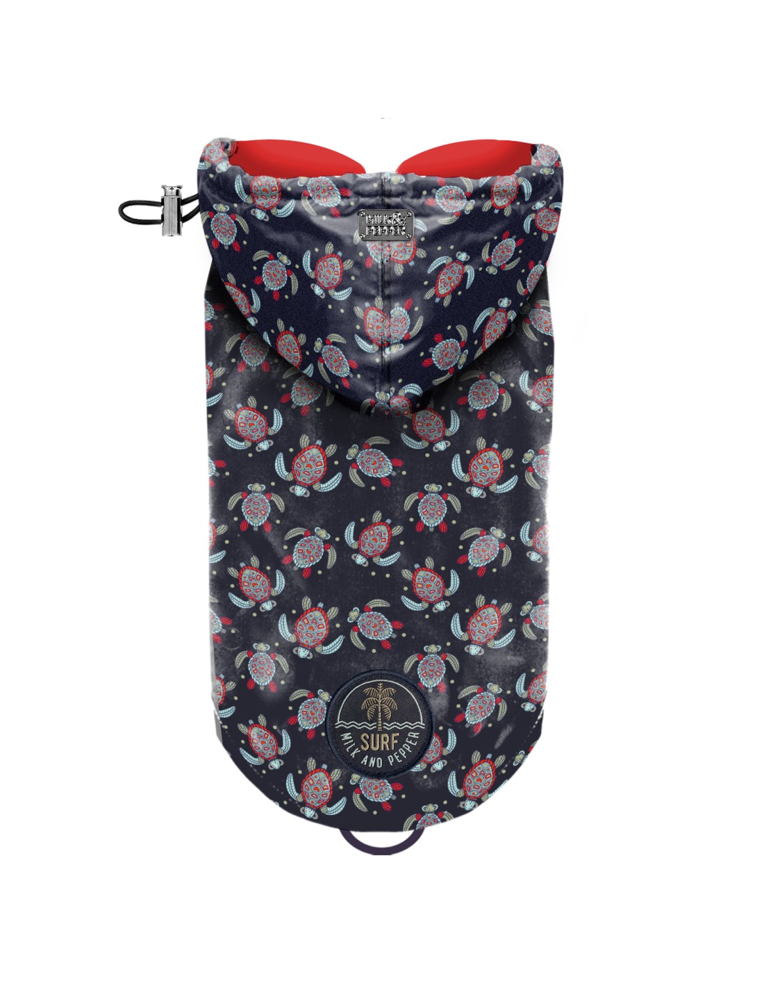 Targhetta in metallo color titanio sul cappuccio con inciso “Milk&Pepper”.