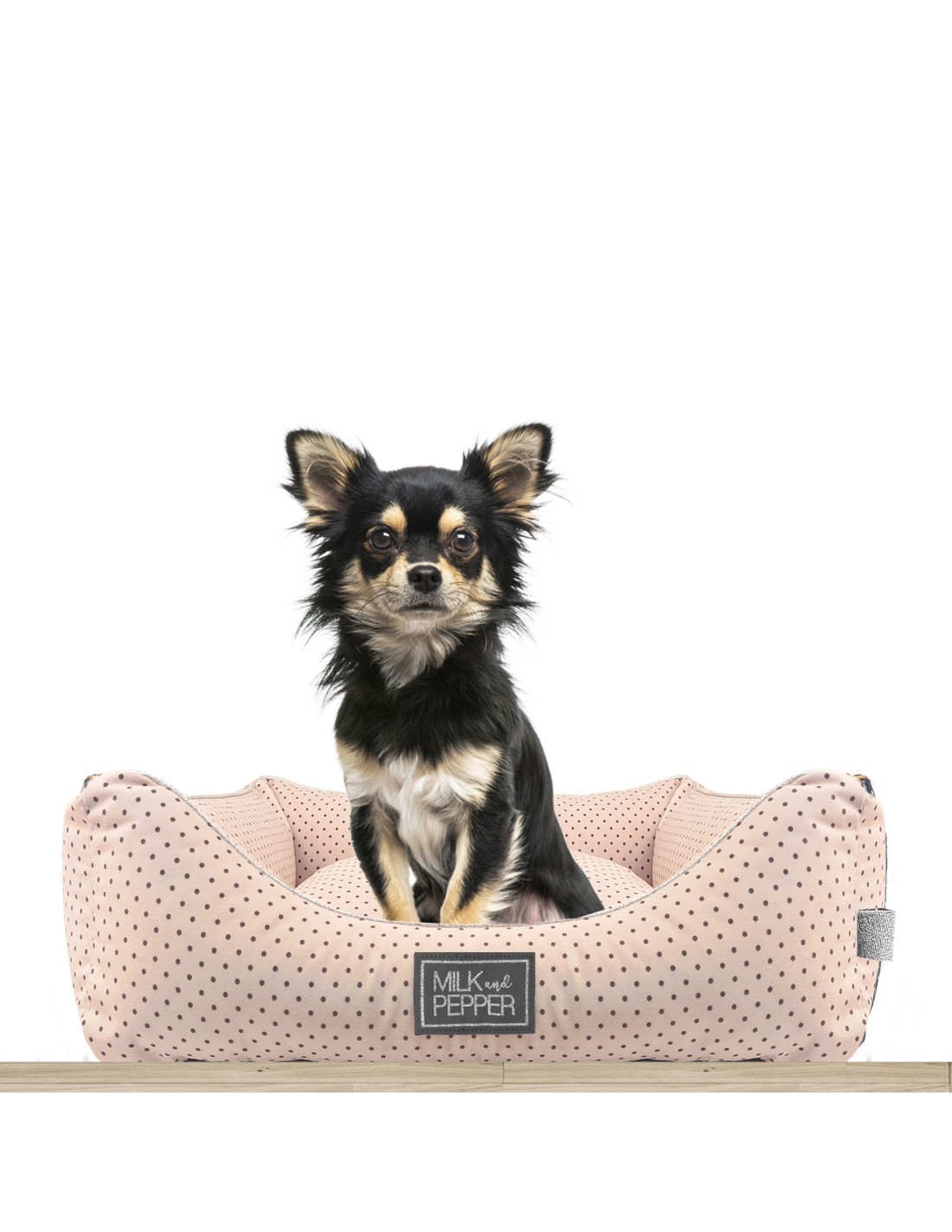 Etichetta color grigio antracite e ricamo Milk&Pepper in lurex argento