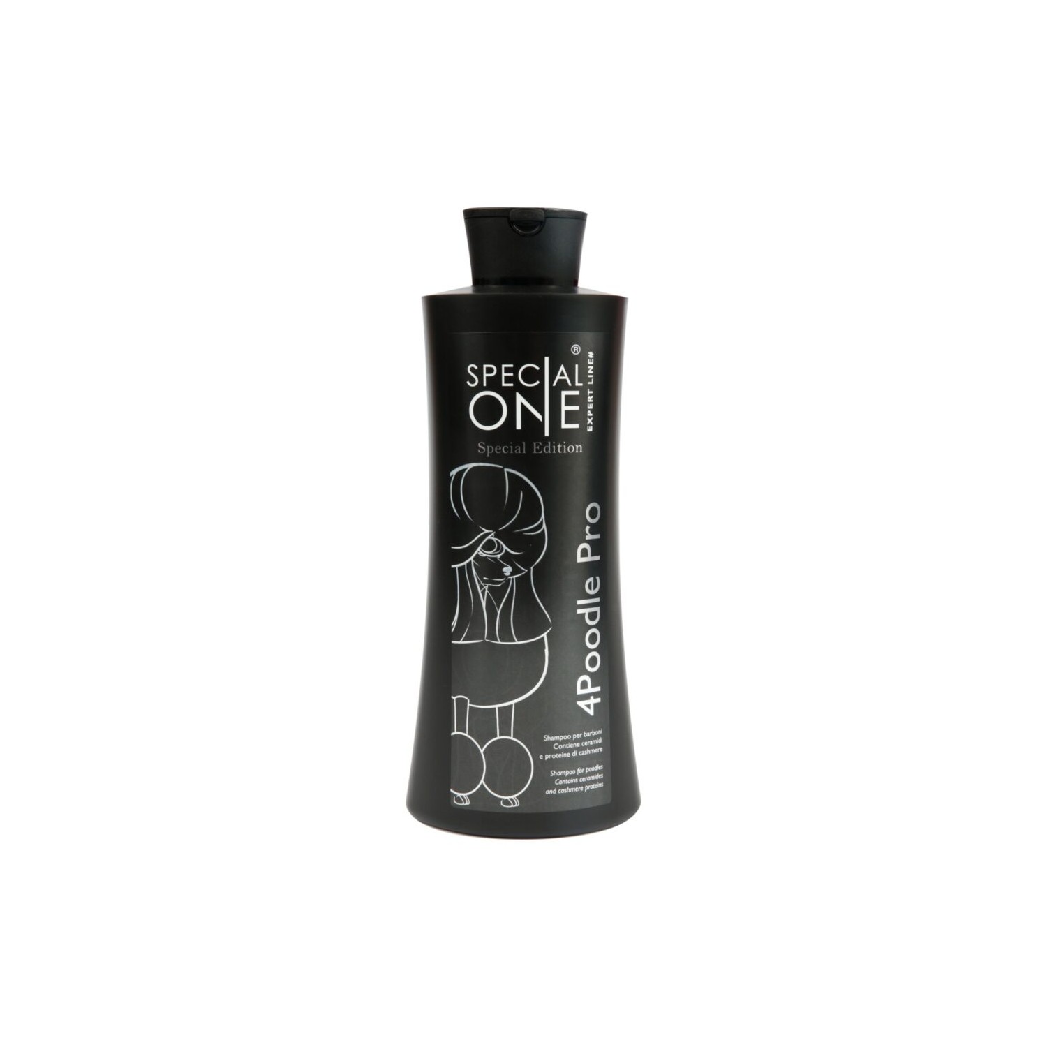 4 Poodle Pro è uno shampoo specifico per il manto riccio del barbone; dona sostegno al manto volumizzando anche quello con tessitura più fine e favorisce lo styling: merito dell’eccezionale elasticità del mantello subito dopo l’utilizzo e dell’intenso effetto cheratinico che dura a lungo. Dopo la detersione, il manto risulterà semplice da stirare e si asciugherà molto velocemente. 4 Poodle Pro è il prodotto ideale per preparare il manto del barbone per tagli e show di bellezza; consigliato anche per le razze Bichon frisé e Bobtail.