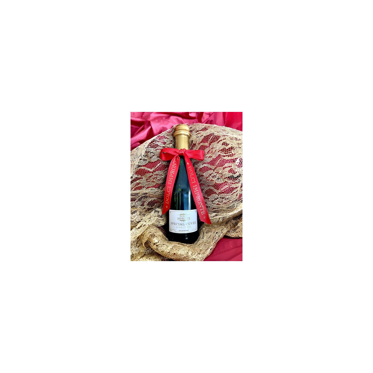 Confezione in bottiglia con pregiato nastro personalizzato Dolci Impronte di colore rosso.